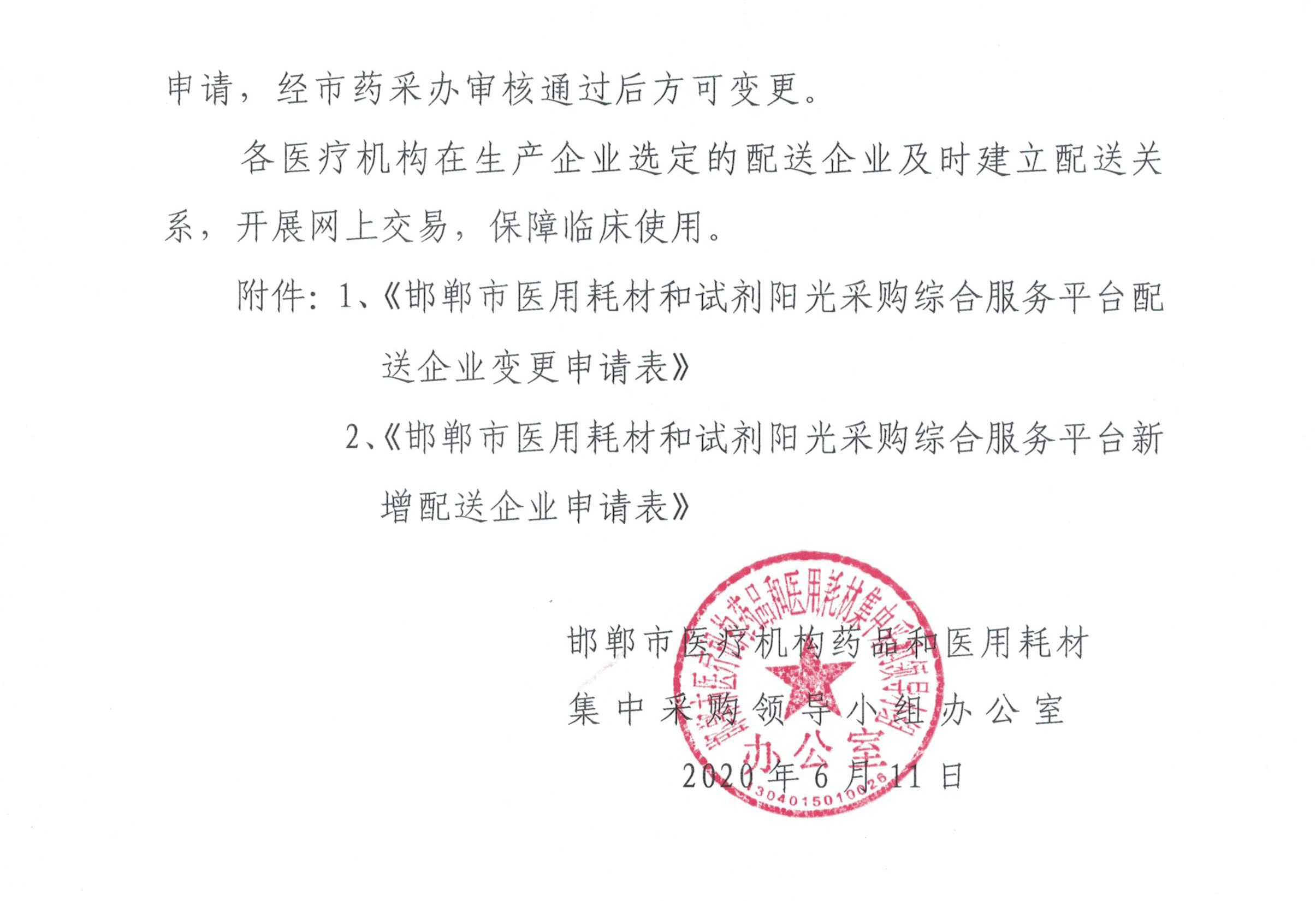 关于规范我市医用耗材(试剂)配送企业数量的通知(邯药采办〔2020〕7号)