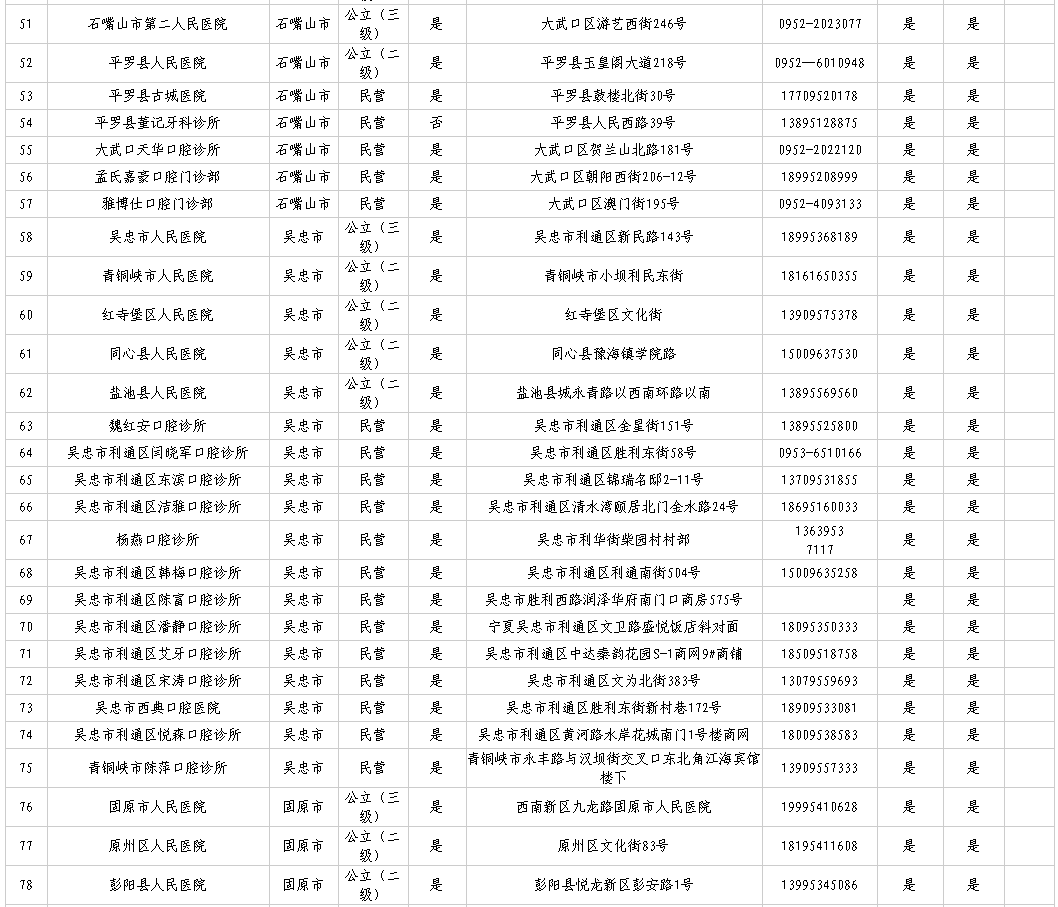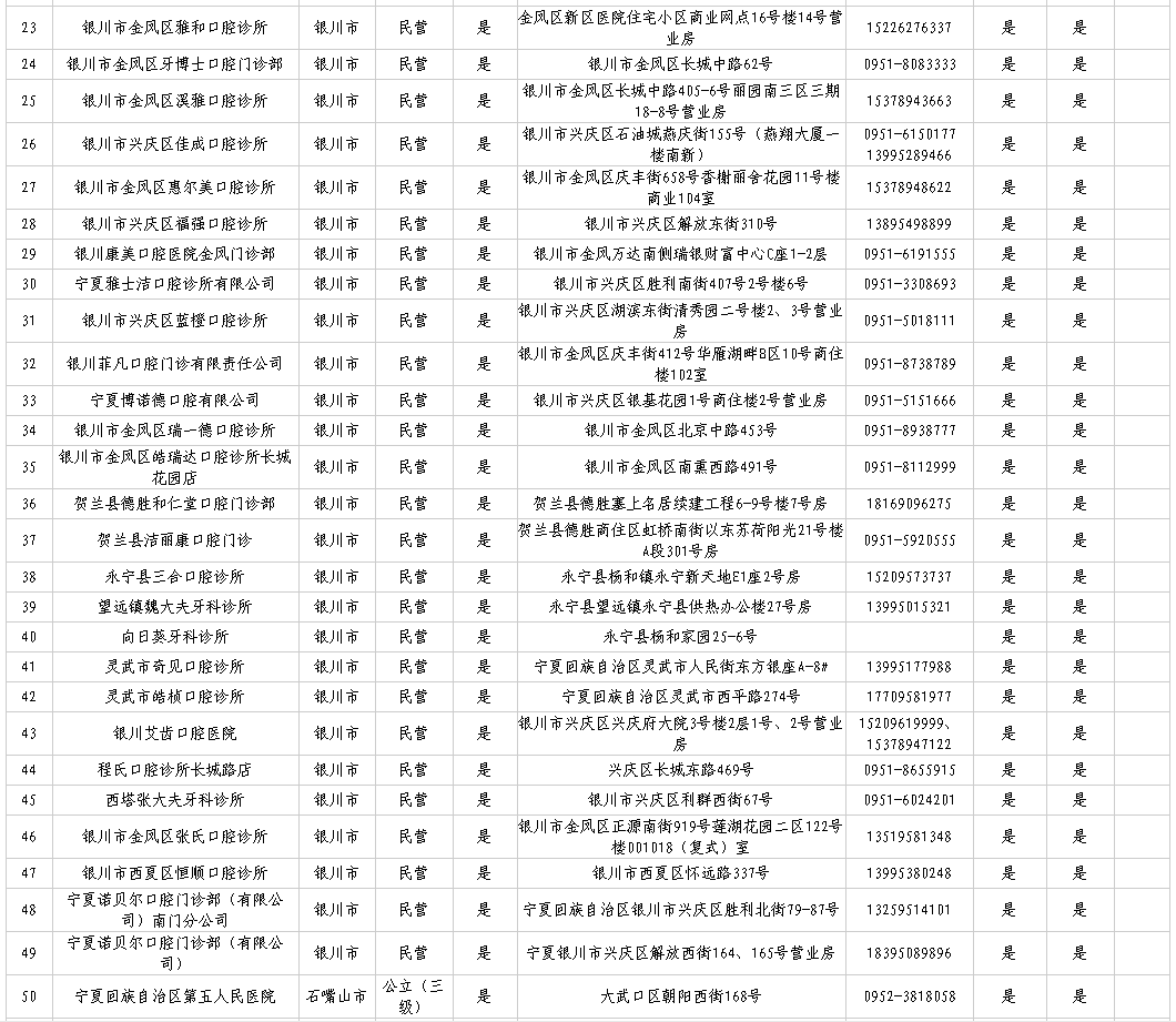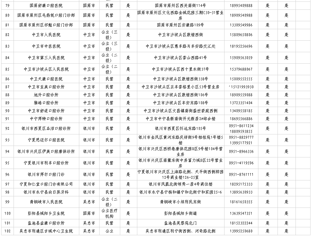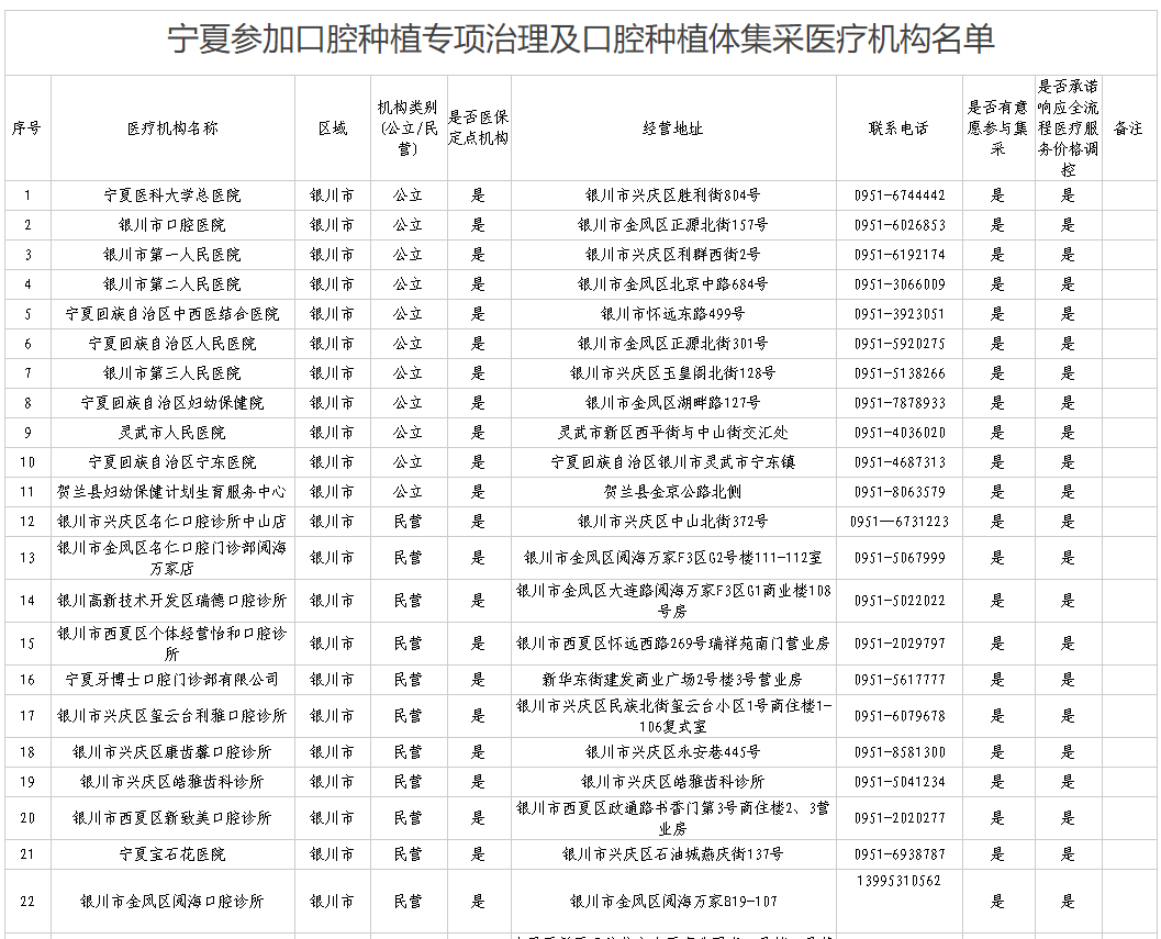 宁夏参加口腔种植专项治理及口腔种植体集采医疗机构名单