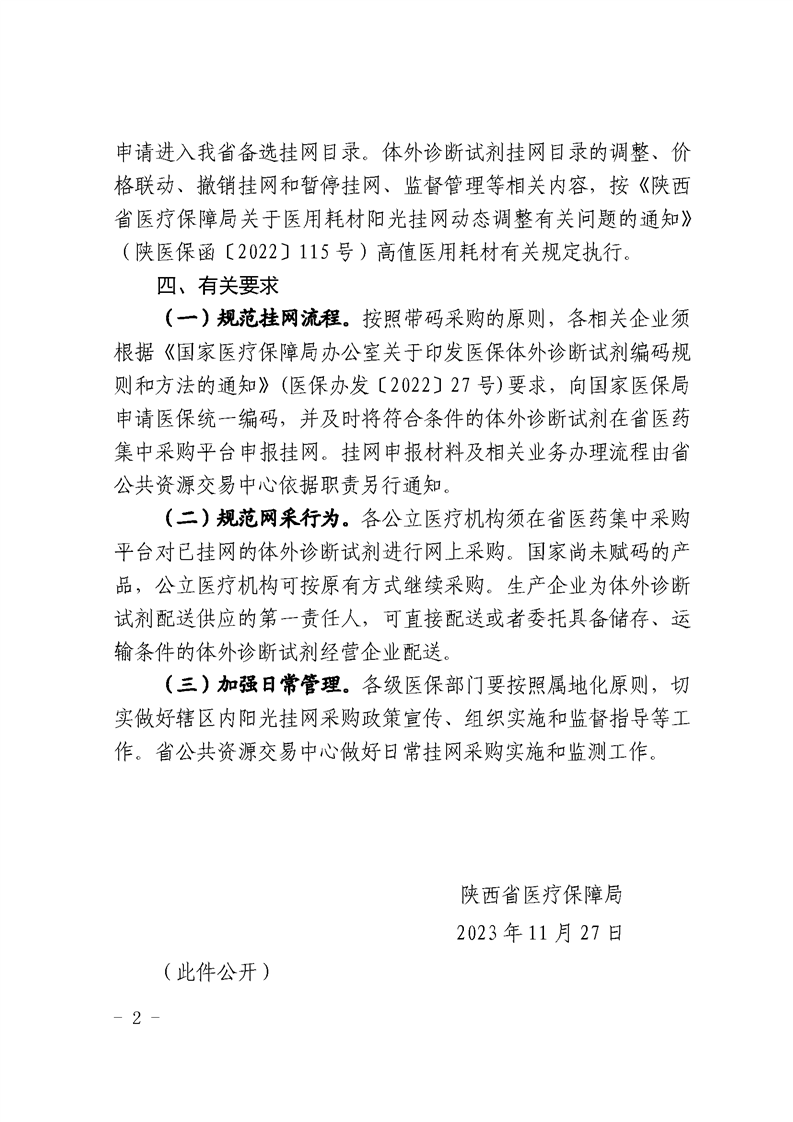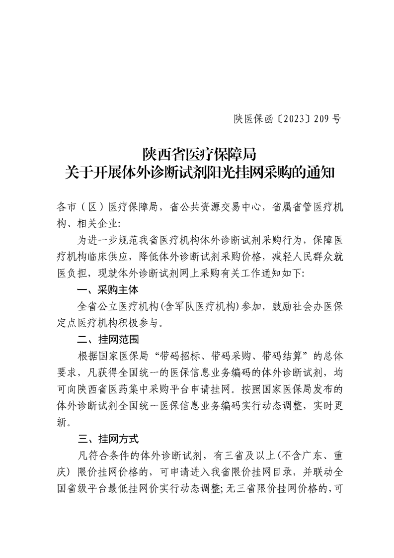 陕西省医疗保障局关于开展体外诊断试剂阳光挂网采购的通知