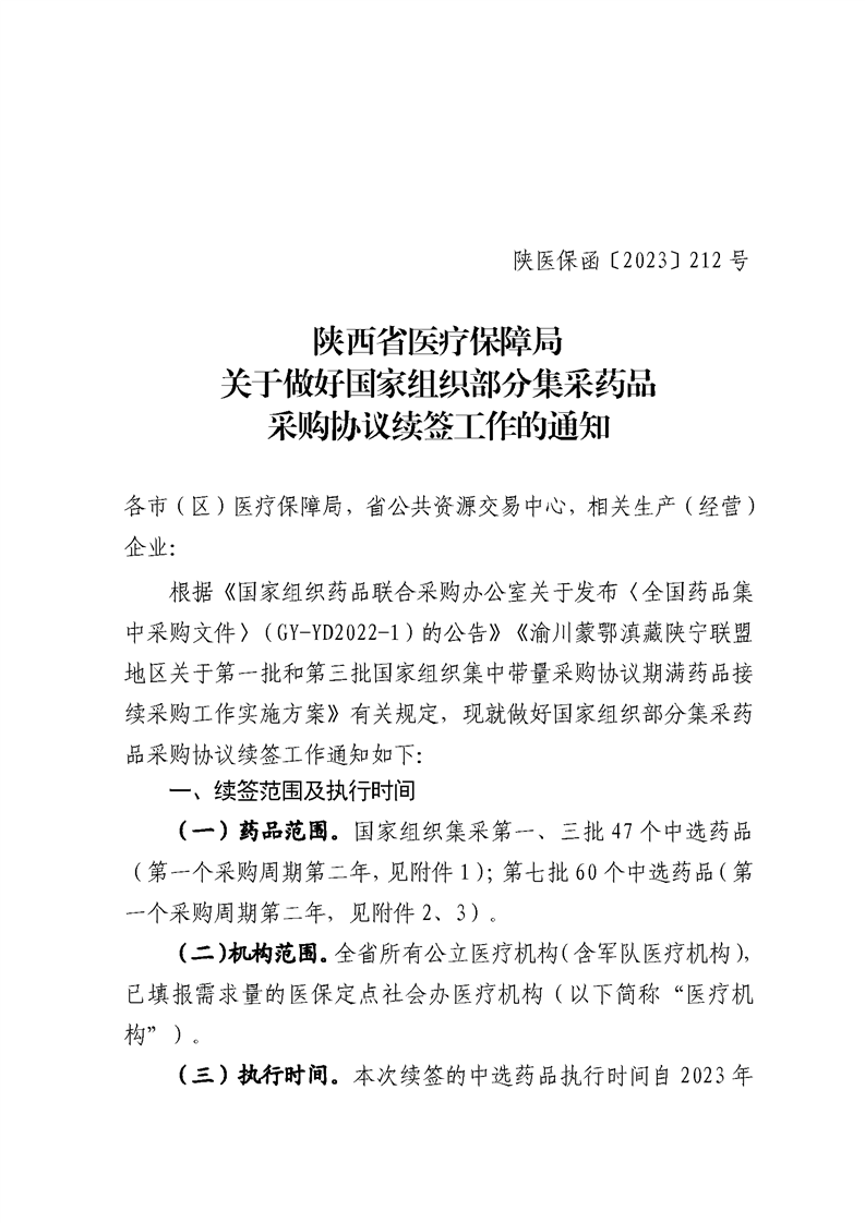 陕西省医疗保障局关于做好国家组织部分集采药品采购协议续签工作的通知