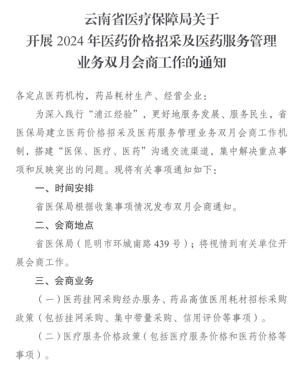 云南省医疗保障局关于开展2024年医药价格招采及医药服务管理业务双月会商工作的通知