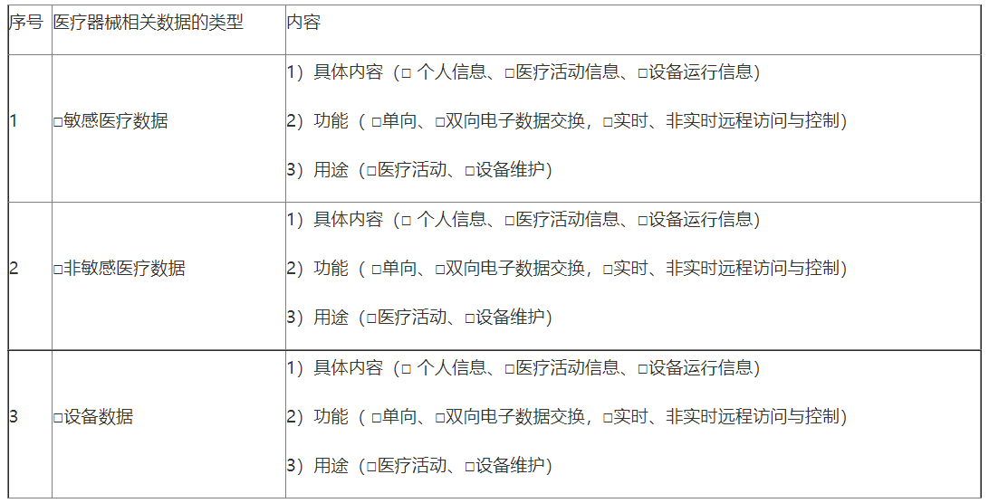 注:敏感数据有个人信息的医疗数据指能够单独或与其他信息结合识别特定自然人个人身份的各种信息,如自然人的姓名、出生日期、身份证件号码、个人生物识别信息(含容貌信息)、住址、电话号码等;设备数据指描述医疗器械运行状况的数据,用于监视、控制医疗器械运行或用于医疗器械的维护维修,不应含有个人信息。