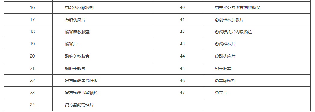 4.西药部分第1255号“缓解感冒症状的复方OTC制剂”包括的品种(通用名称)见下表: