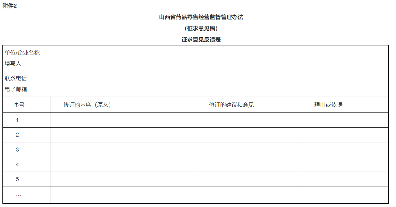 为加强药品零售经营管理,保障群众用药安全有效,鼓励发展新业态新模式,激发药品零售市场活力,促进药品零售行业高质量发展,依据《中华人民共和国药品管理法》《中华人民共和国药品管理法实施条例》《中华人民共和国行政许可法》《药品经营和使用质量监督管理办法》《药品网络销售监督管理办法》《药品经营质量管理规范》《药品检查管理办法(试行)》等法律法规规章的有关规定,结合我省实际,我局起草了《山西省药品零售经营监督管理办法(征求意见稿)》。现面向社会各界公开征求意见,请于2025年1月5日前,填写《意见反馈表》并加盖印章,将有关意见反馈我局。