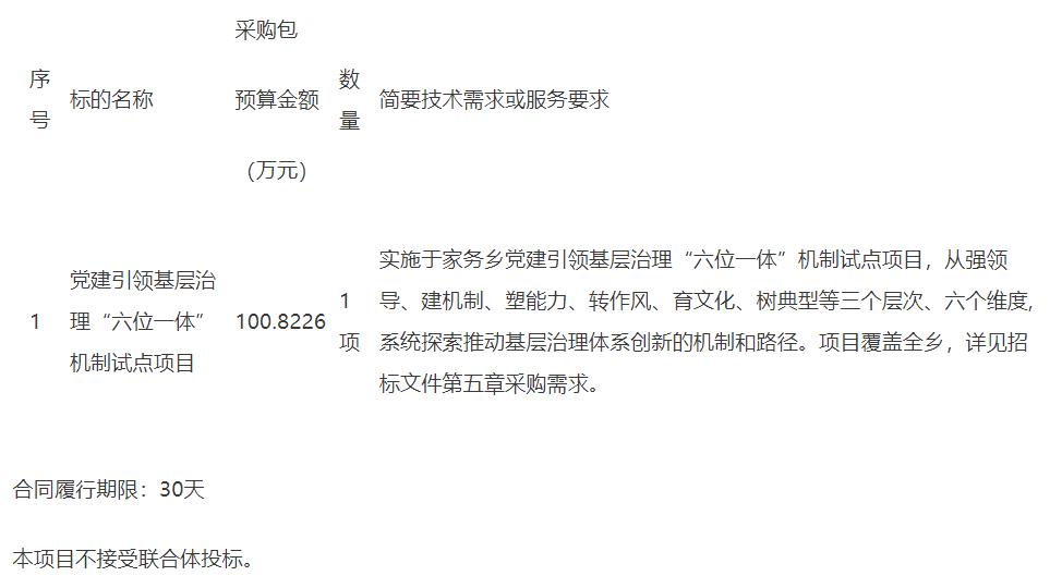 党建引领基层治理“六位一体”机制试点项目招标项目的潜在投标人应在北京市政府采购电子交易平台获取招标文件,并于2025-01-26 09:30(北京时间)前递交投标文件。