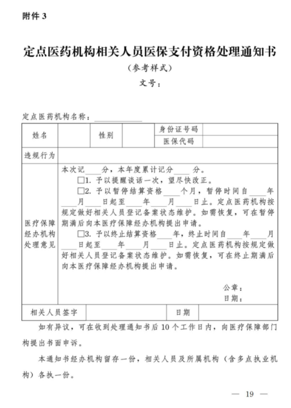 第三十三条 医疗保障经办机构出具处理通知书后,3个工作日内送达相关责任人员发生本次记分处理行为所在的定点医药机构。相关责任人员登记备案状态需维护为暂停或终止的,其发生本次记分处理行为所在的定点医药机构根据处理通知书完成登记备案状态维护。
