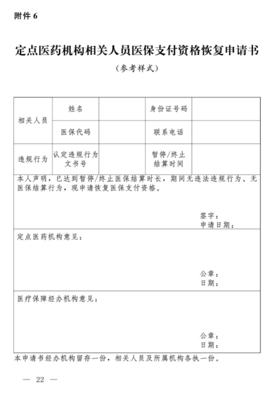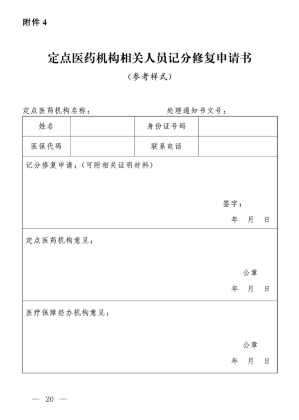 相关人员提出记分修复申请的,经其所在定点医药机构审核同意后,报属地医疗保障经办机构。医疗保障经办机构收到申请后,根据实施细则对相关人员整改情况进行复核,对积极改正、主动参与本机构医保管理工作的可以采取减免记分、缩减暂停或终止期限等修复措施。
