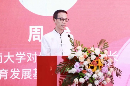 暨南大学教育发展基金会副秘书长周治致辞。他表示,暨南大学教育发展基金会事业发展聚焦学校战略和中心工作,推进“双一流”和高水平大学建设,为学校提供了有力支撑,这些成绩离不开校友和社会各界的慷慨支持。沈英森教授和家人以深厚的学术造诣和对教育事业的无限热爱,为学院的发展注入了新的活力。黄忠亨校友的成功故事是学院人才培养成果的生动体现,他的捐赠不仅是对学院的回馈,更是对后辈学子的鼓舞和激励。教师校友们对暨南大学中医学院的贡献是多方面的,他们不仅在学术上有所成就,更是在社会服务、文化传播等方面发挥着重要作用。