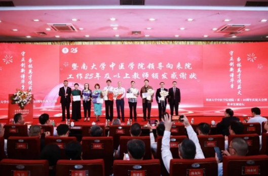 随后,教师代表孙立教授发言。他表示,25年来,学院教师贯彻落实立德树人根本任务,立德修身,以身作则,用智慧和汗水浇灌“杏苗”。今后,学院教师将继续秉承“忠信笃敬”的校训精神,不断深化教育教学改革,为培养优秀中医药人才贡献师者力量。