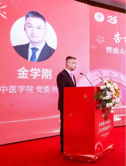 广东省中医药局医政处郭洁吾处长致辞。她表示,暨南大学是我省高水平大学重点建设高校,综合性特色显著,交叉融合潜力大。近年来,中医学院认真贯彻落实习近平总书记考察广东和暨南大学重要讲话精神,在学科建设、教学科研、人才培养、社会服务等方面均取得显著的成绩。希望学院以建院25周年为新起点,主动作为,奋发有为。坚持立德树人,牢记为党育人为国育才的初心使命,培养可堪大用能担重担的中医药栋梁之材;坚持守正创新,面向国家重大需求和人民生命健康,聚焦中医药科技前沿和关键领域,系统梳理研究中医药经典理论,运用现代科学技术,推动中医药理论与技术革新,提高原始创新水平和科研成果转化效能,以高校中医药力量推动广东中医药产业发展,为广东经济社会发展作出更大的贡献。