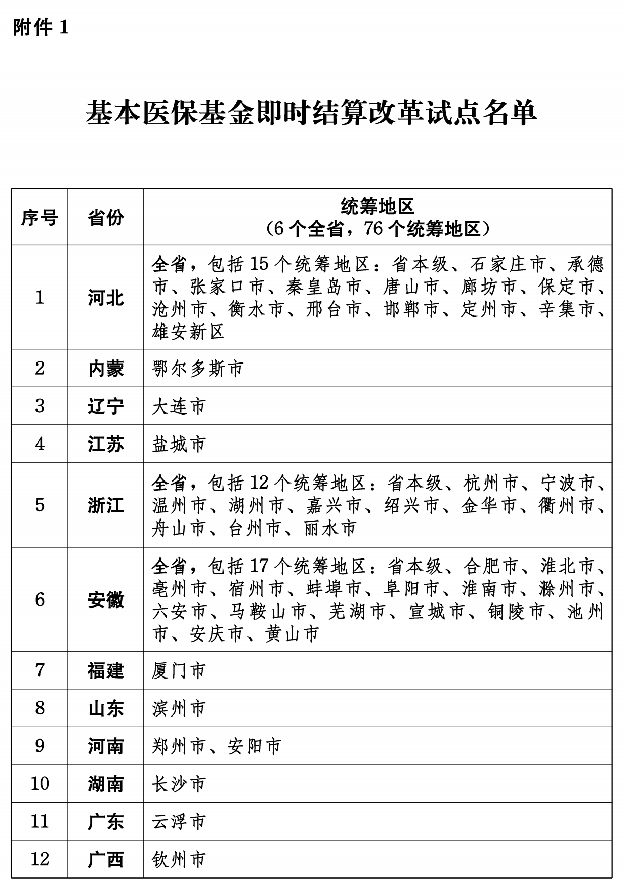 附件:1、基本医保基金即时结算改革试点名单