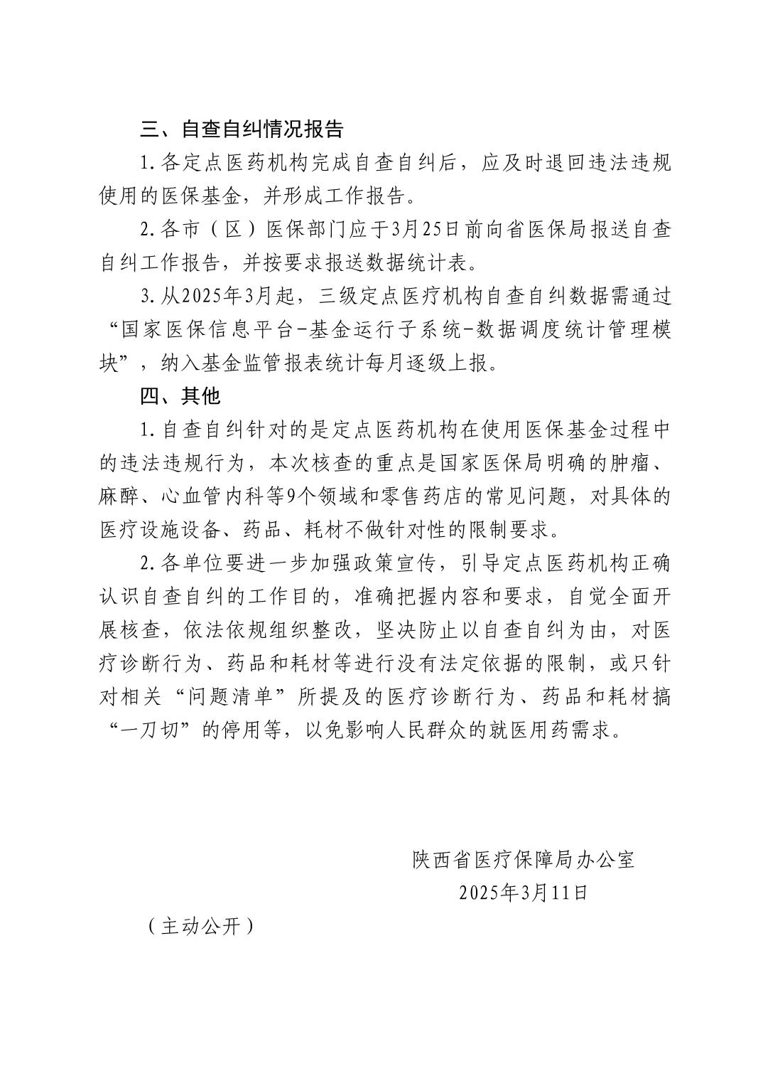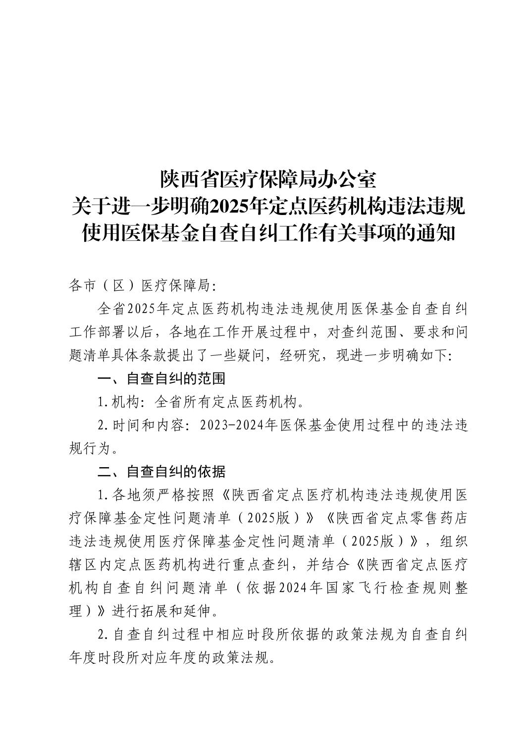 陕西省医疗保障局办公室关于进一步明确2025年定点医药机构违法违规使用医保基金自查自纠工作有关事项的通知