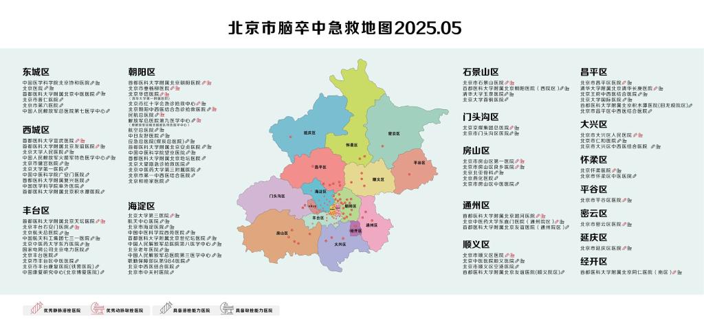 5月15日,北京市百万减残工程推进会在首都医科大学宣武医院举办。会上,2025年版北京市脑卒中急救地图正式发布,覆盖16个市辖区86家急性脑卒中救治能力的医疗机构,较2024年版脑卒中急救地图增加了8家医疗机构。截至目前,北京市每个区至少有1家具备静脉溶栓能力和动脉取栓能力的医院,实现“溶栓不出区”的目标。