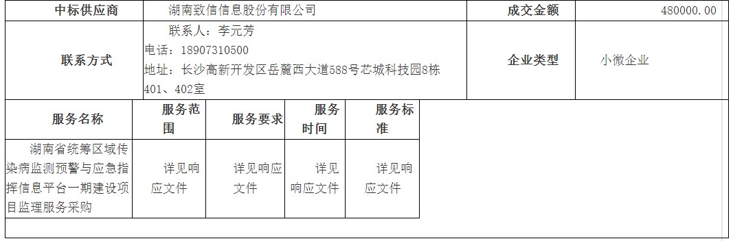 湖南省疾病预防控制局的湖南省统筹区域传染病监测预警与应急指挥信息平台一期建设项目监理服务采购竞争性磋商项目于2025年05月30日结束,现将中标(成交)结果公告如下: